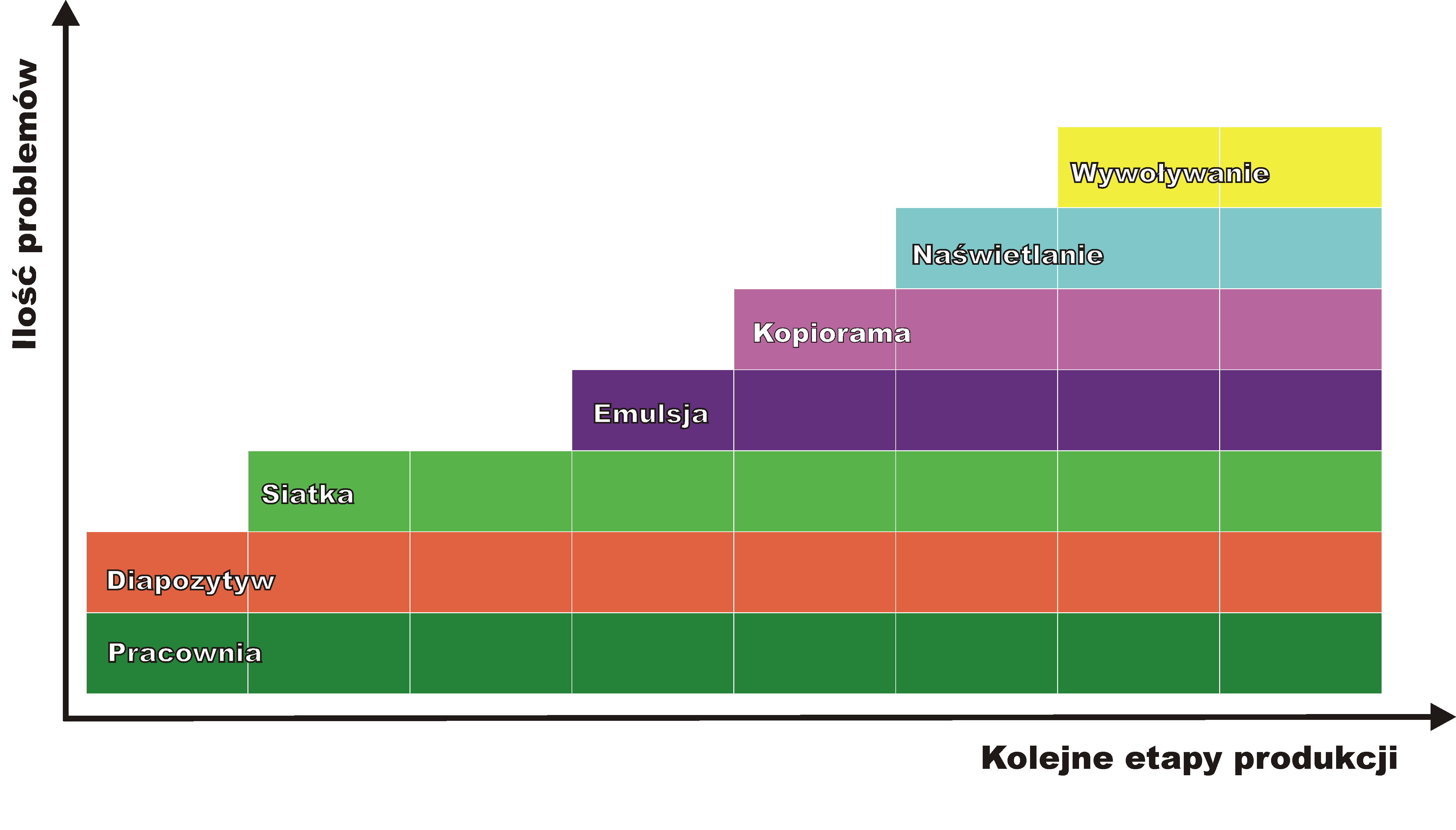 Powyższy wykres pokazuje jak kolejno narastają problemy, usterki i błędy - nawarstwiające się przy każdym kolejnym etapie przygotowania szablonu sitodrukowego. Co gorsza, większość z nich objawia się dopiero podczas druku, a takie niemiłe niespodzianki potrafią skutecznie zaszkodzić.